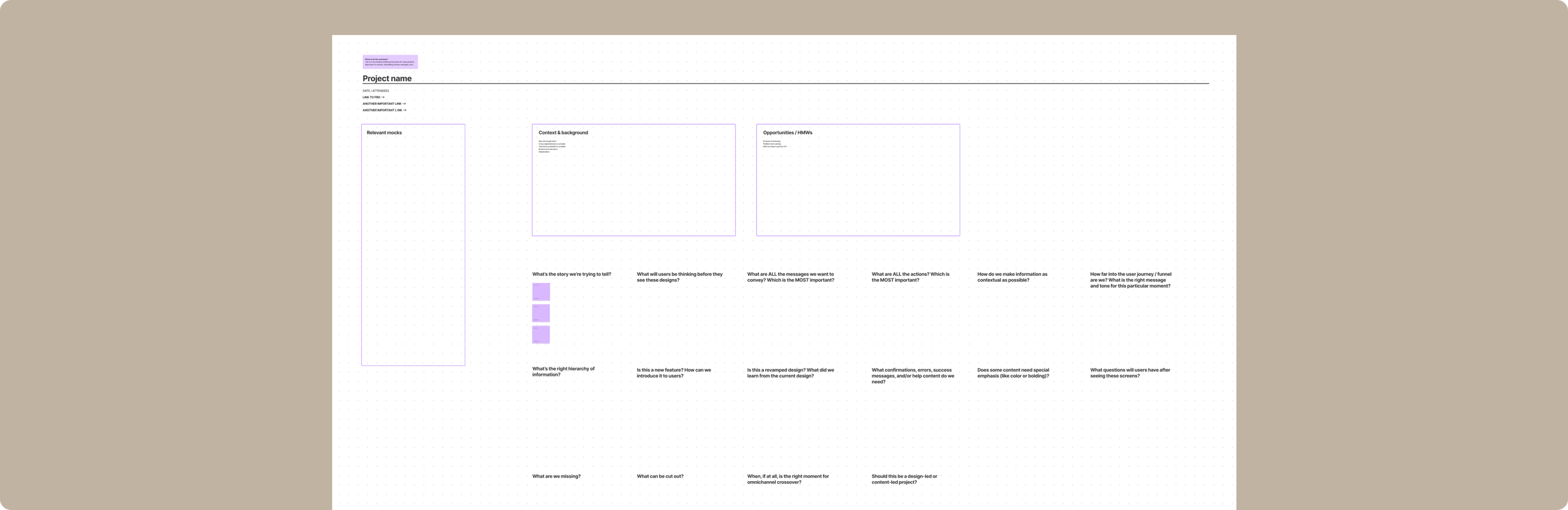 My favorite content strategy questions to ask at the beginning of a project. Typically done as a workshop with design, PM, and engineering, with stakeholders and leadership as needed.