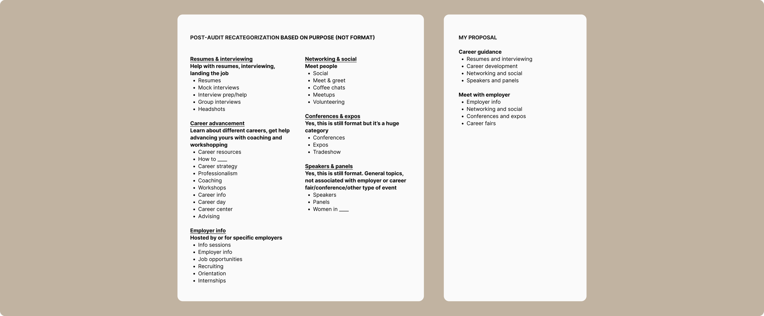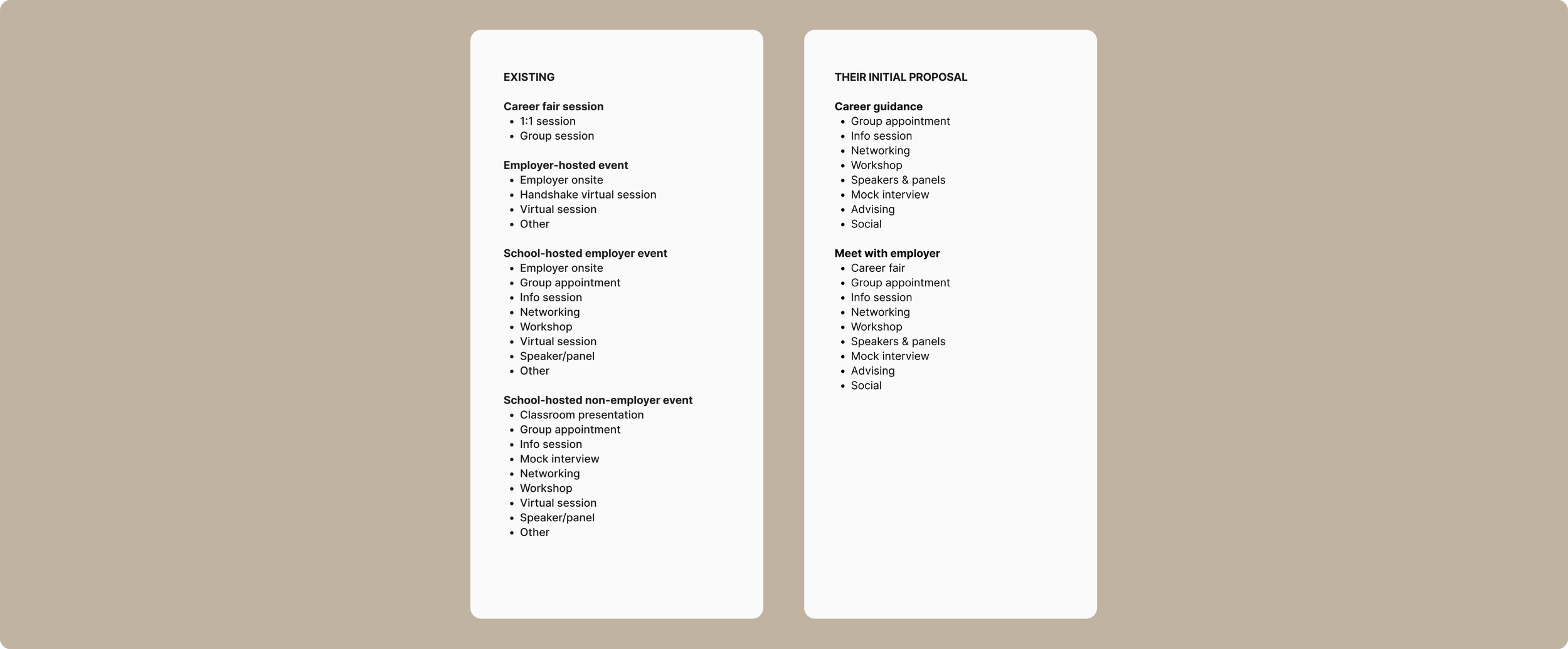 The product requirements of this project were straightforward. Based on previous research, we knew we wanted to group events into 2 primary categories, “Meet with employers” and “Career guidance” (exact naming TBD), then rename and condense the existing 23 event categories under the 2 primary categories. The product manager came to me already having done some work on this and proposed a much simpler list.